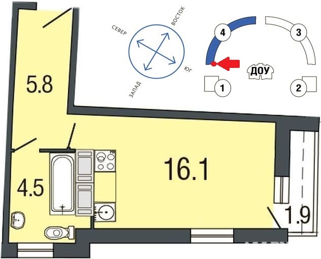 этаж: 4 (всего: 19), кол-во комнат: 1 Продам студию в ЖК Ultra City 4й корпус,