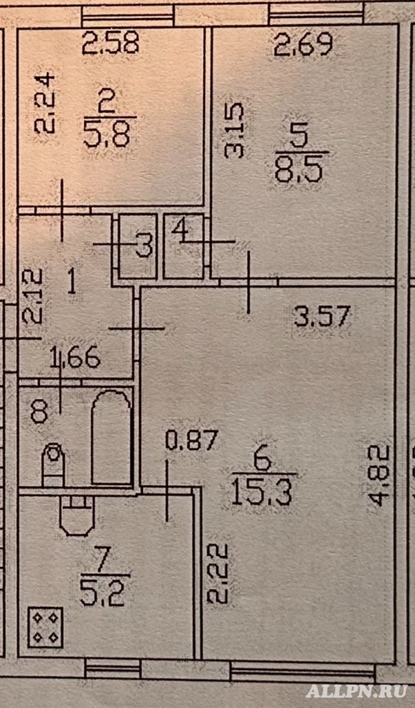 Общая площадь 41.3 кв.м, смежно-изолированные комнаты (15.3+8.5)+5.8 кв.м, кухня 5.2 кв.м Совмещенный санузел. Требуется ремонт.